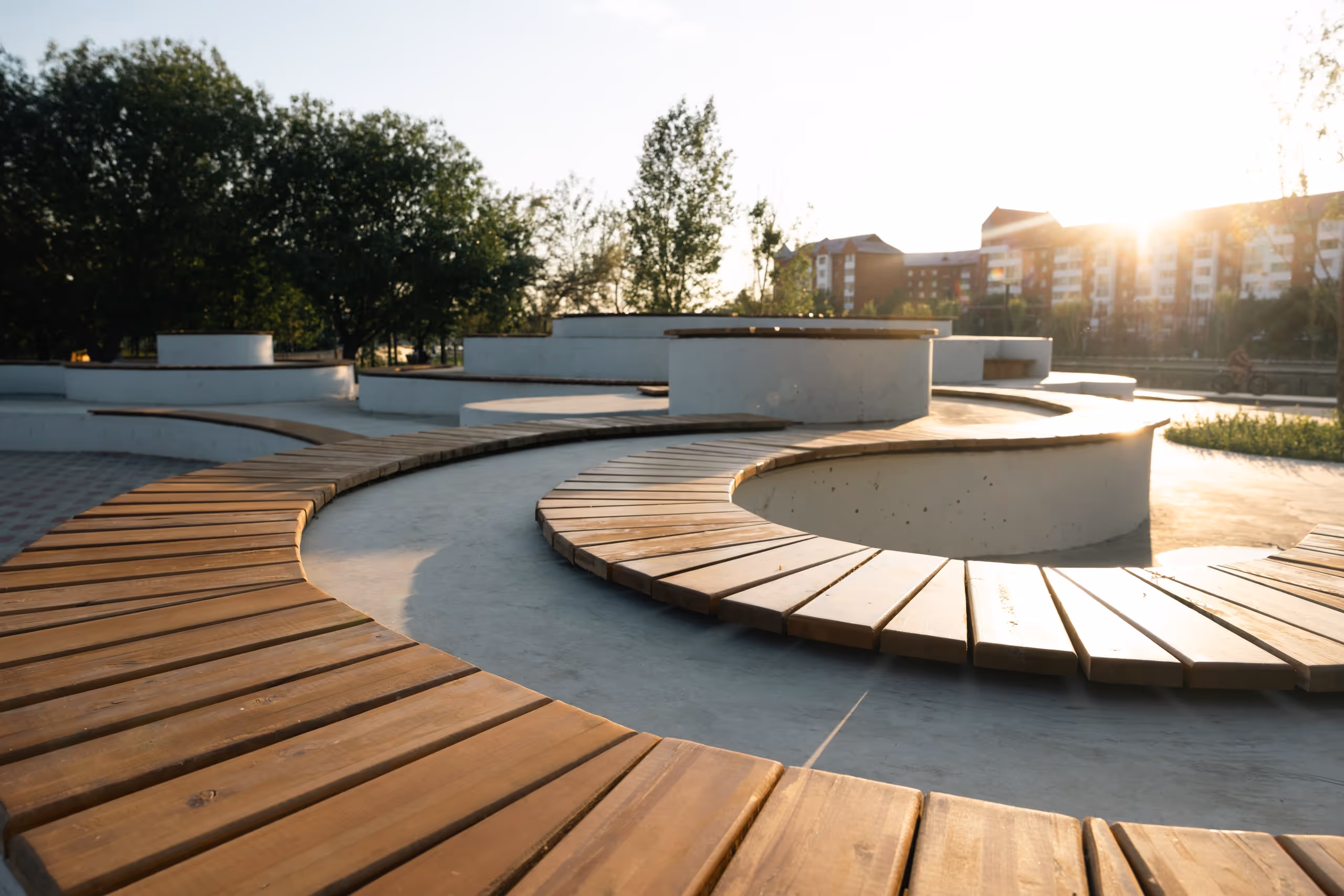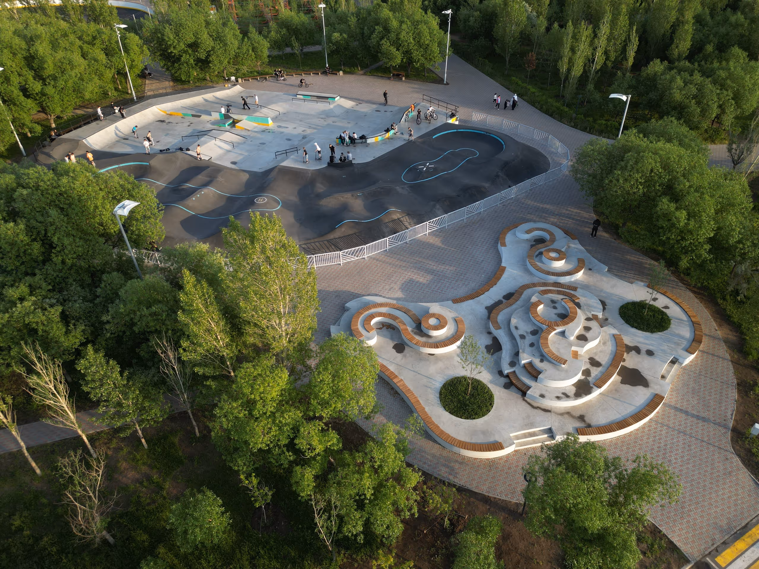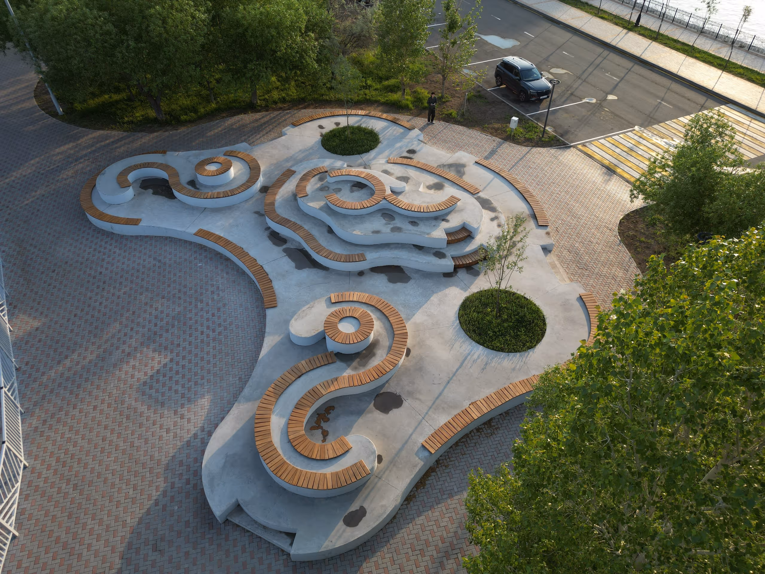 Этот объект представляет собой монолитную многоярусную площадку, оборудованную лавками для комфортного отдыха, а так же детский бетонный скалодром с зип‑лайном и горкой.